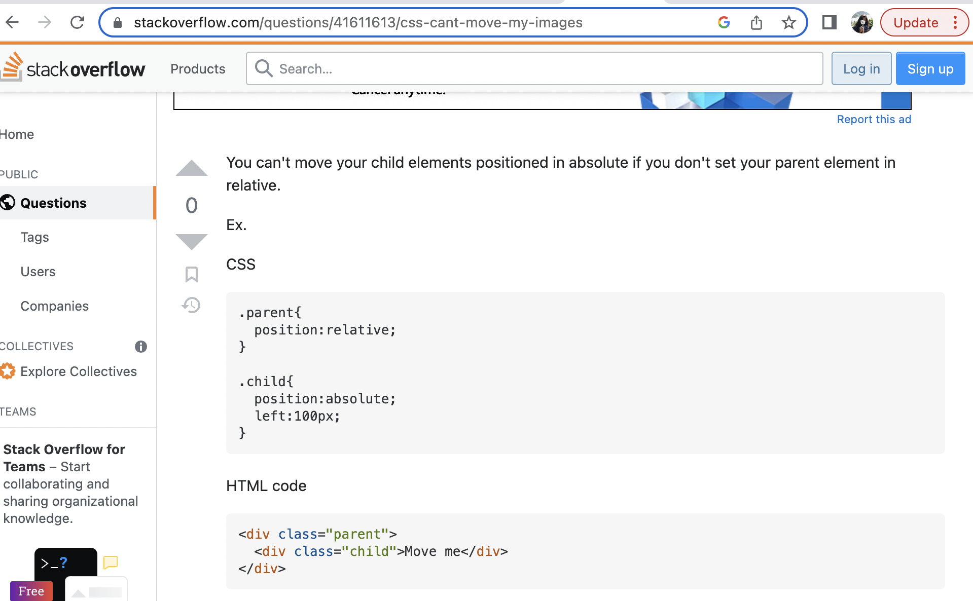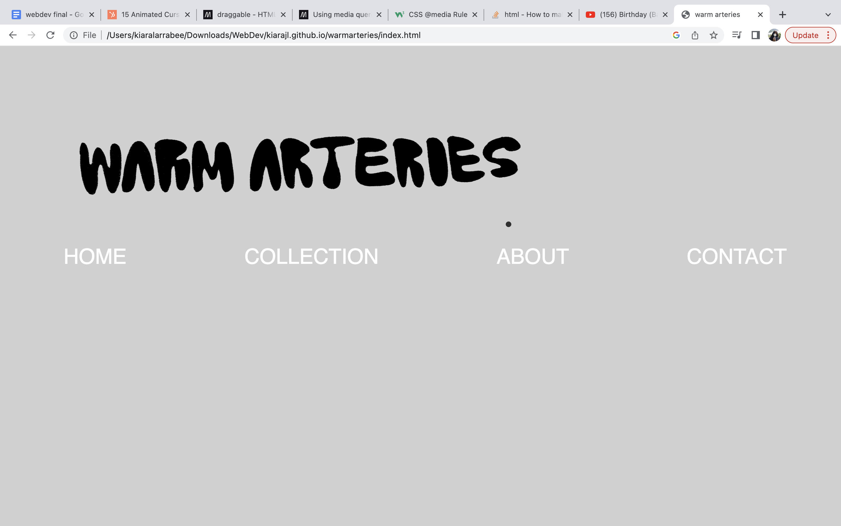 The first issue I ran into was not being able to align things properly on the page. The warm arteries title I had at first refused to be centered, but I overcame that by putting the parent element position in relative and the child elements in absolute.