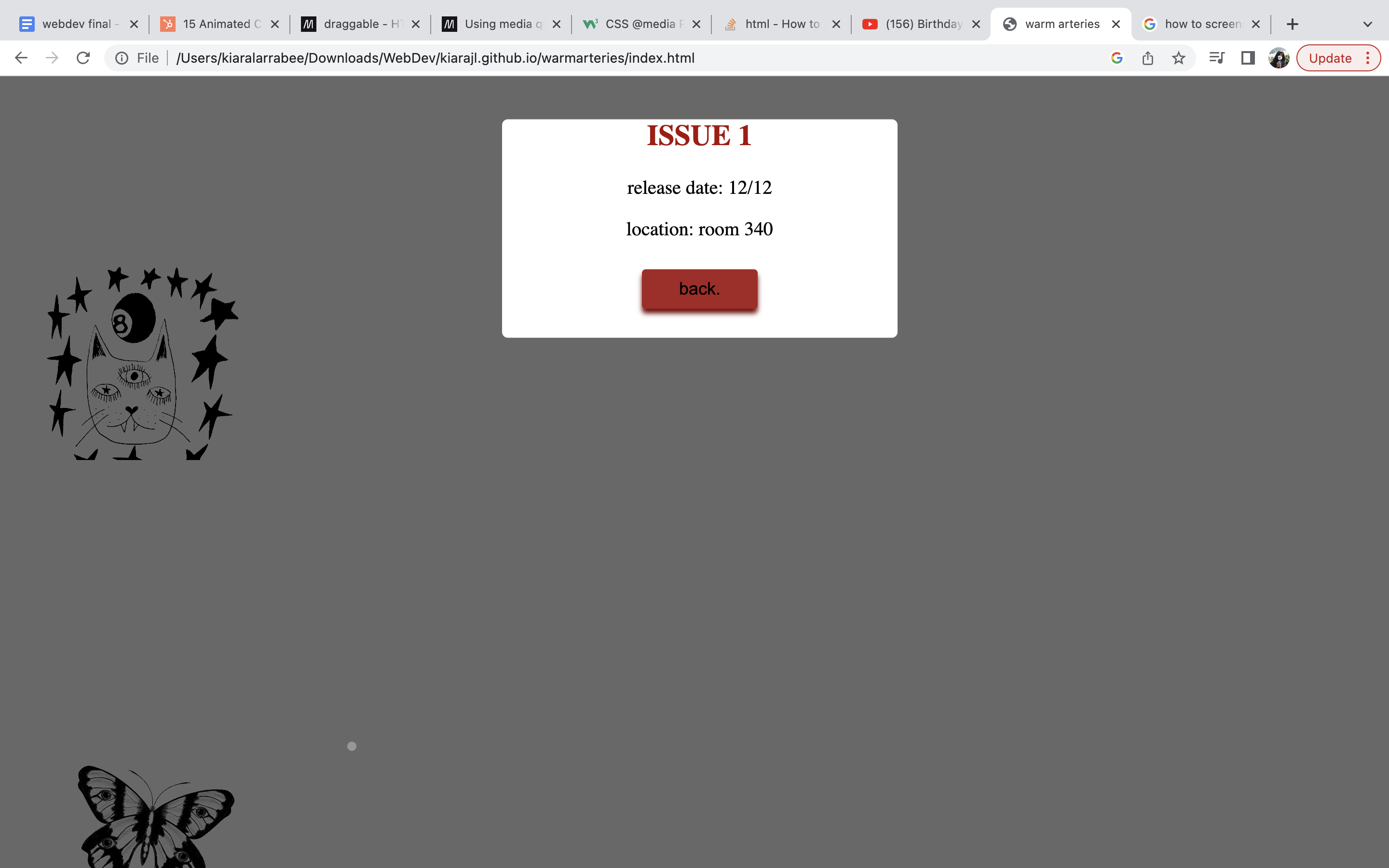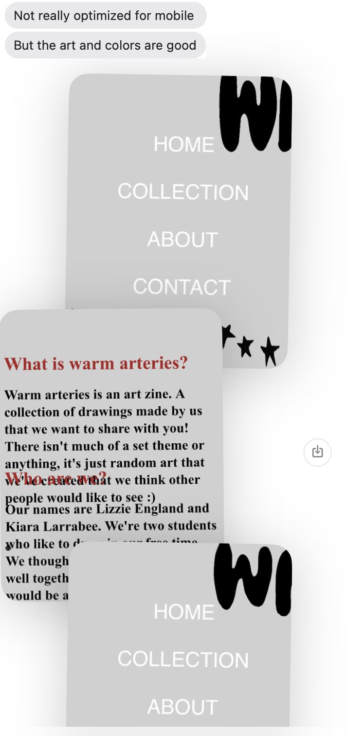 After the user testing, I took their feedback and continued on making the rest of the website. Things went pretty smoothly except for the popup buttons. I still am unable to figure out how to make them different :(. Also the directory buttons stopped working when you're in the collection page which is upsetting because they were working before but then they just suddenly stopped, so I also have to keep trying to fix that.